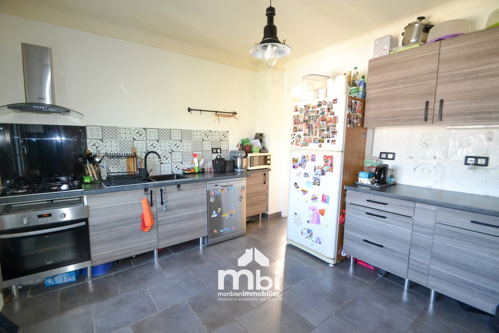 Maison Individuelle édifiée sur cave totale. La maison équipée de panneaux solaires comprend 6 pièces principales avec un sas d'entrée, une entrée, une cuisine indépendante aménagée, un séjour et un wc. A l'étage deux chambres, une salle de bains avec douche et un wc. Au 2 ème étage, 3 chambres. Garage indépendant. Le terrain est de 380 m2. Le double vitrage est en pvc avec volets électriques et le chauffage est au gaz de ville. Tableau électrique récent. Les Honoraires sont à la charge du vendeur. https://www.monbienimmobilier.fr/baremes/ Les informations sur les risques auxquels ce bien est exposé sont disponibles sur le site Géorisques. http://www.georisques.gouv.fr